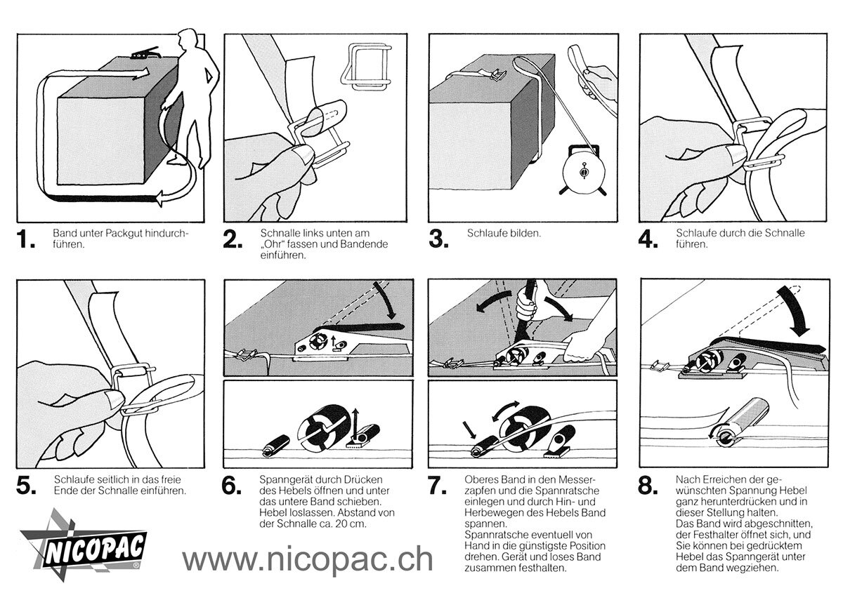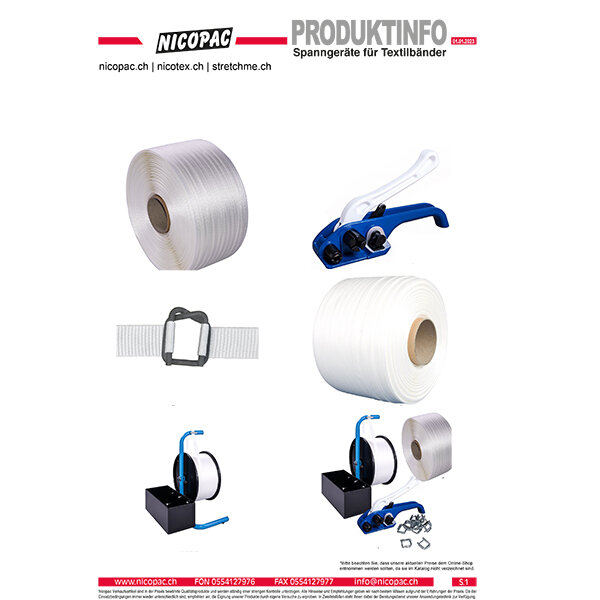 NICOTEX-Gewebeband: die preiswerte Alternative zu Stahlbändern, Seilen und Gurten (dauerhafter Halt auch bei hohen Gewichten). UV-stabilisiert, witterungsbeständig, chemikalienfest, rostet nicht, elastisch (keine Druckstellen oder Kratzer), schlag- und stossabsorbierend, problemlos nachspannbar, garantiert schneller und absolut sicherer Verschluss nach dem Gürtelprinzip (selbstschliessende Bandklemme), springt nicht auf beim Öffnen (dadurch keine Verletzungsgefahr), einfaches Handling, leichte Entsorgung (Recycling). NICOTEX schont das Packgut (keine scharfen Kanten) und passt sich allen Formen an. << mehr>>